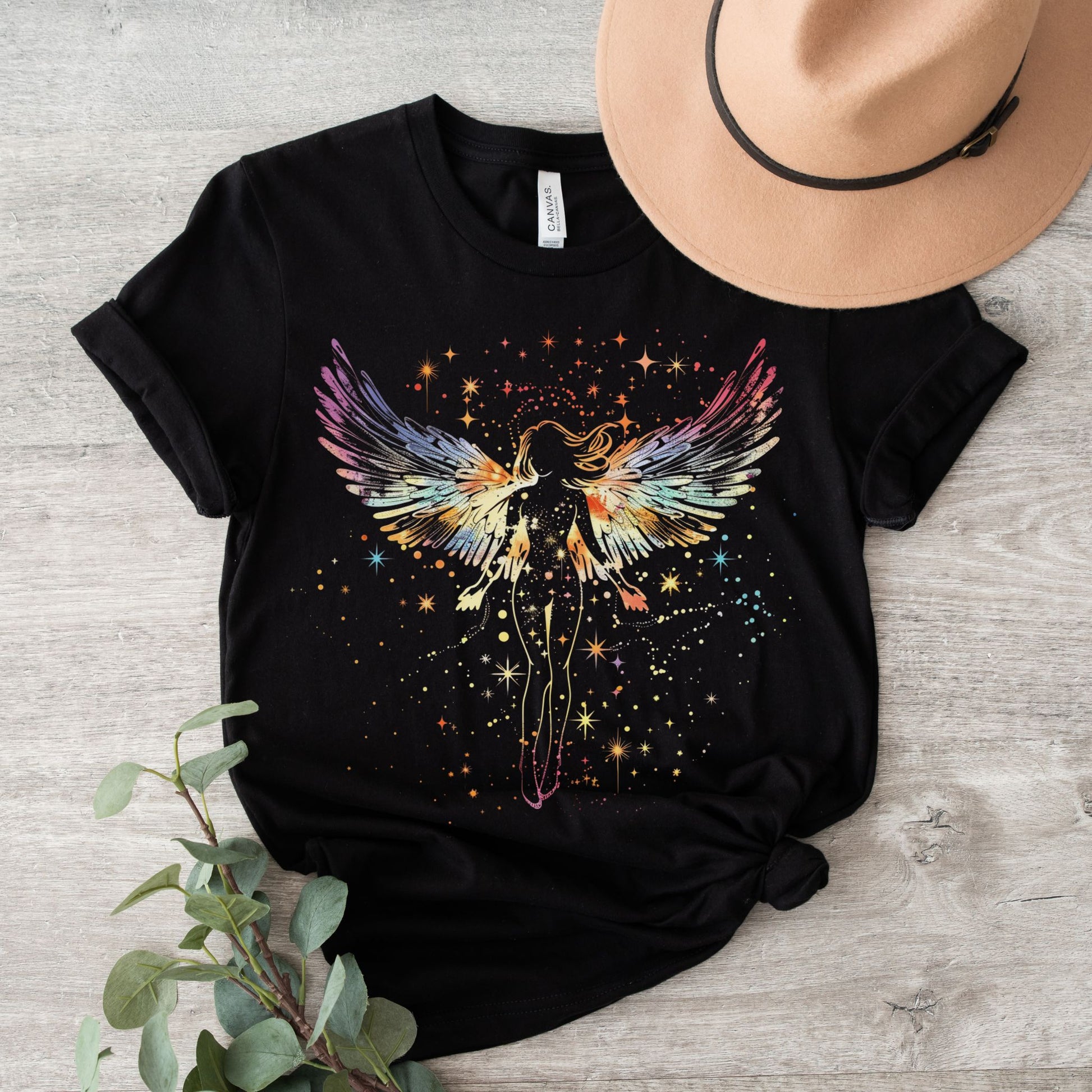 Embrace your celestial essence with our Angel Stardust t-shirt — a radiant and feminine design featuring a divine angel bathed in stardust, glowing and surrounded by the cosmos. This heavenly piece symbolizes protection, spiritual connection, and the luminous energy that guides awakened souls.
