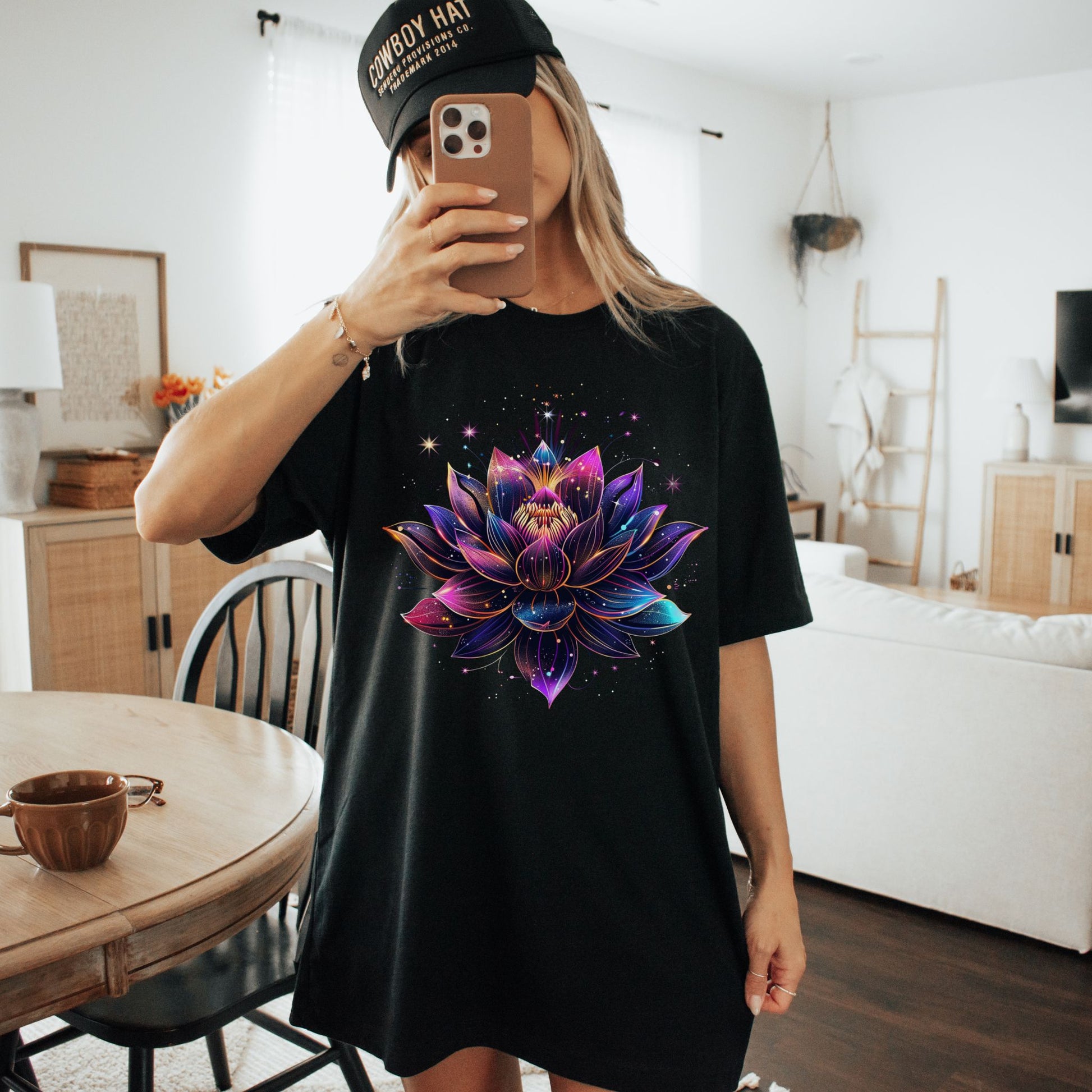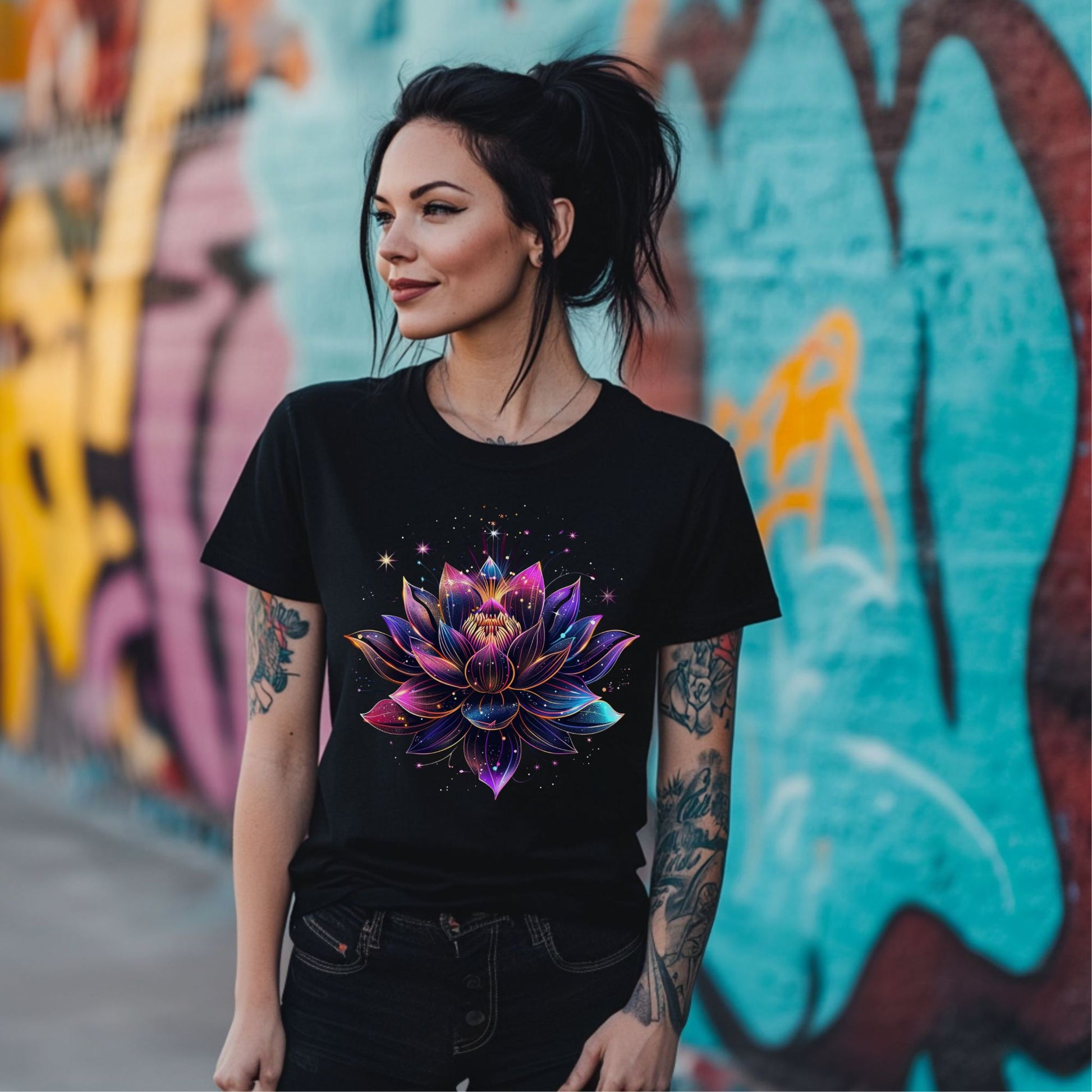 Radiate divine beauty with our Celestial Lotus Bloom t-shirt — a stunning design that features a glowing lotus flower surrounded by shimmering stars and vibrant cosmic colors. The lotus, a timeless symbol of spiritual awakening and inner peace, is brought to life with dreamy hues and galactic magic.