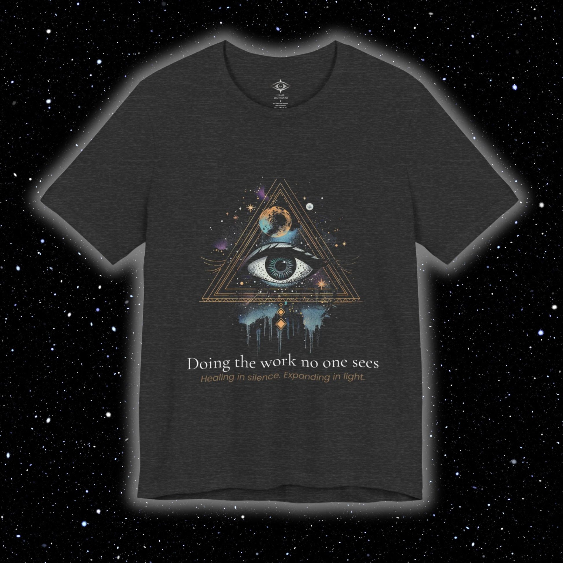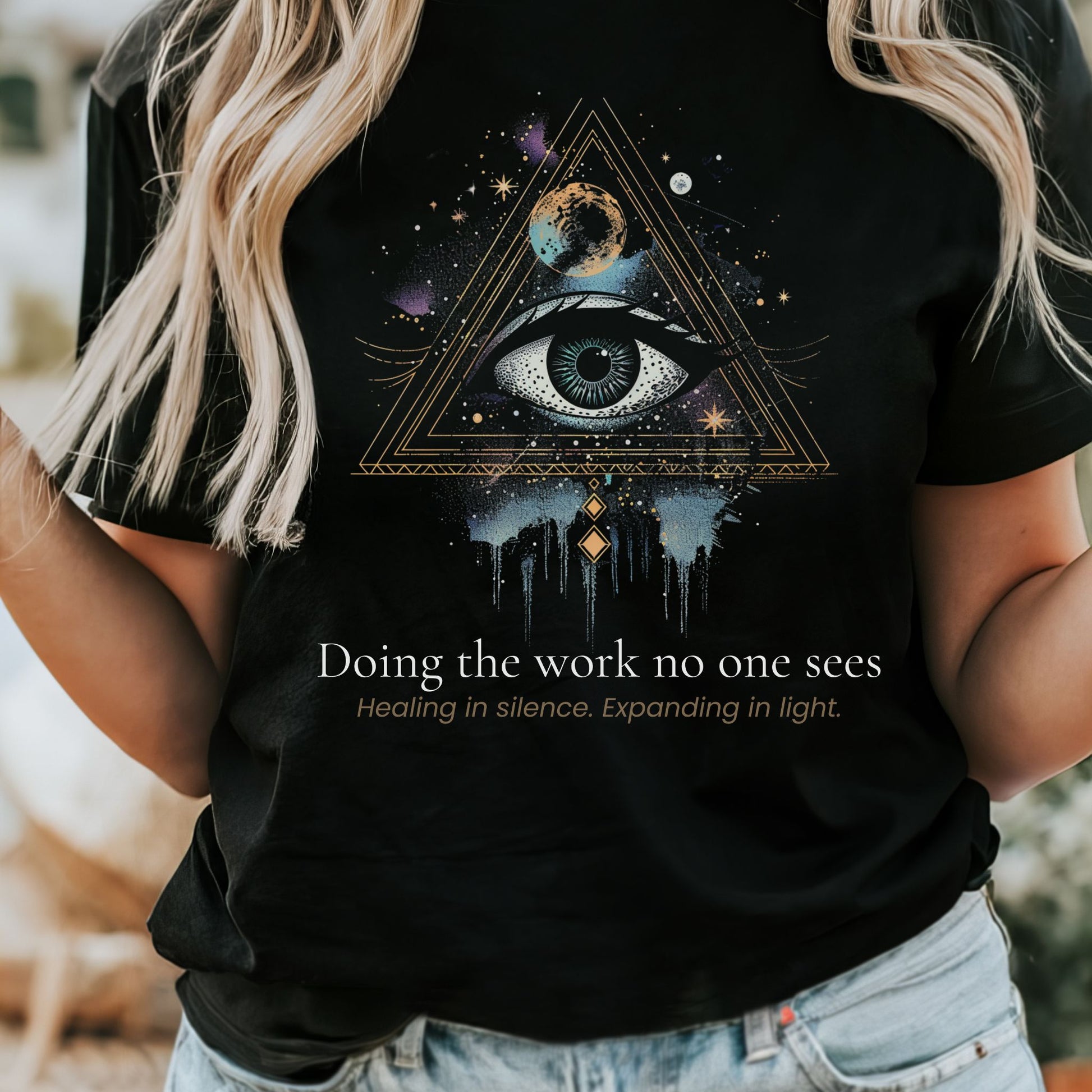 Hidden Realms is a tribute to the quiet warriors — the ones healing behind the scenes, rising through the shadows, and doing the deep inner work no one applauds. With its radiant cosmic eye and bold mystical lines, this design symbolizes unseen strength, higher awareness, and the sacred path of self-evolution. It’s not about who notices. It’s about who you become.